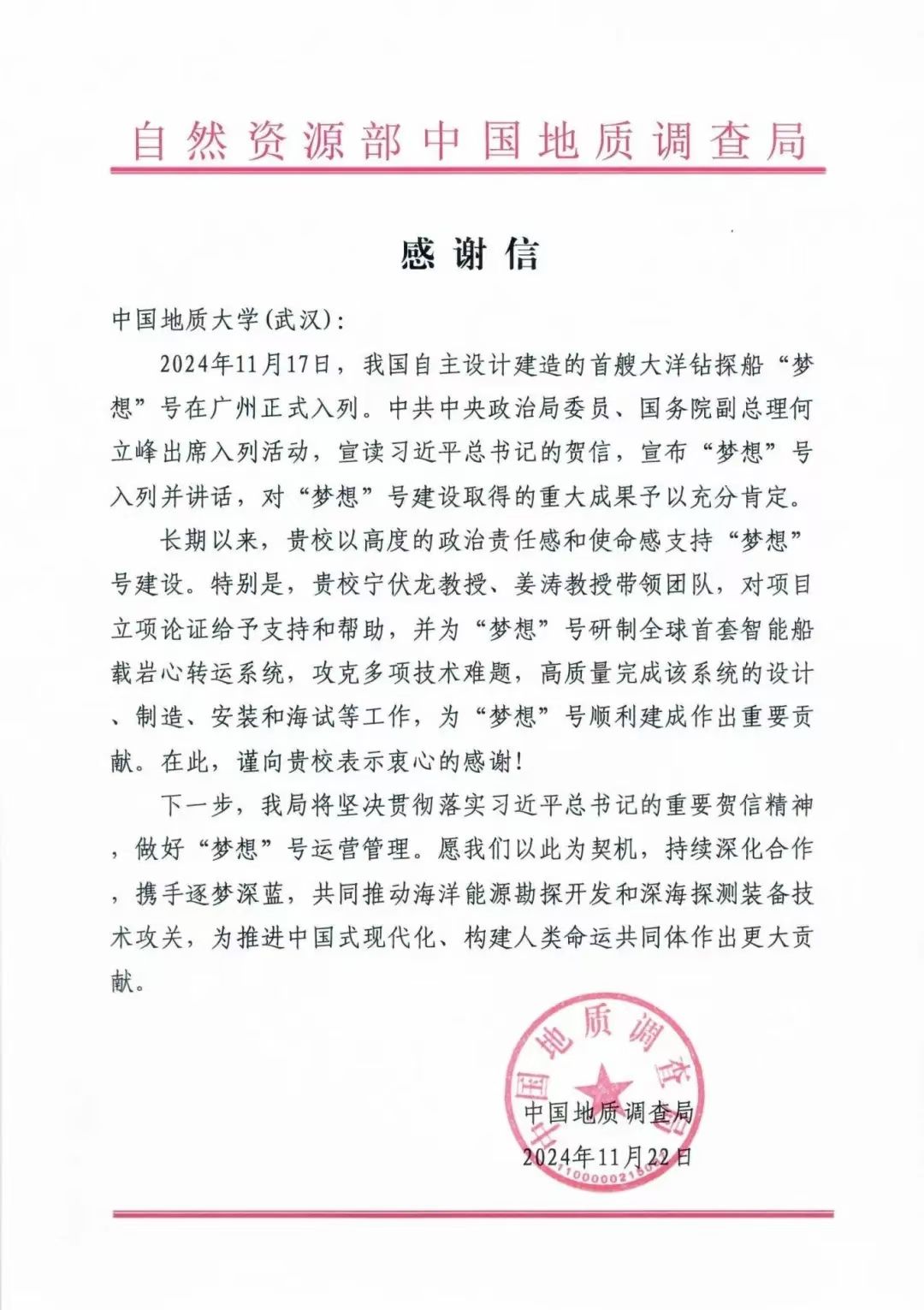 感谢信中指出,我校宁伏龙教授、姜涛教授带领团队,对项目立项论证给予支持和帮助,为“梦想”号研制全球首套智能船载岩心转运系统,攻克多项技术难题,高质量完成该系统的设计、制造、安装和海试等工作,为“梦想”号顺利建成作出重要贡献。