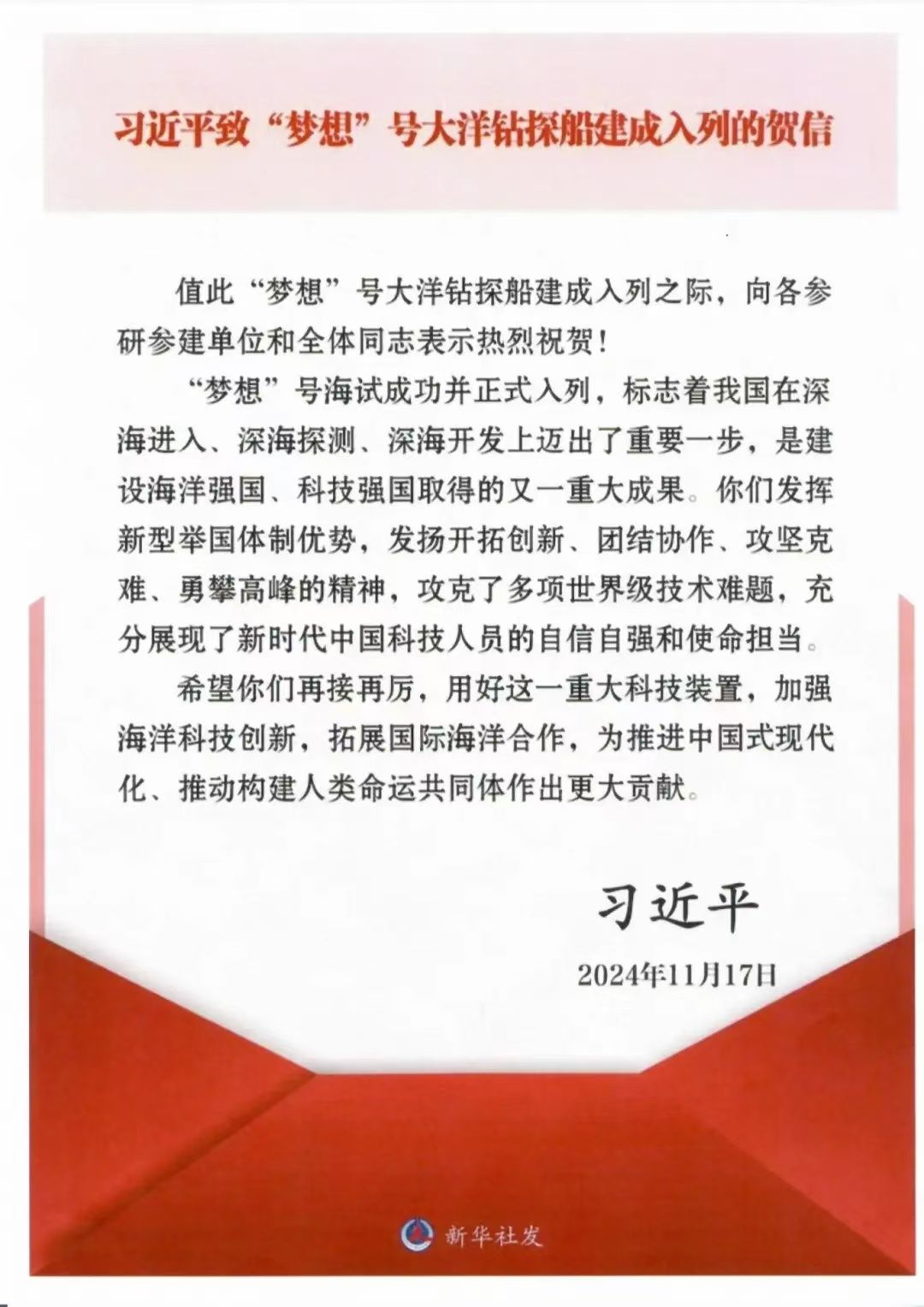 2024年11月17日,我国自主设计建造的首艘大洋钻探船“梦想”号在广东广州正式入列,标志着我国深海探测关键技术装备取得重大突破。中共中央总书记、国家主席、中央军委主席习近平发来贺信,表示热烈祝贺。习近平总书记在贺信中指出,“梦想”号海试成功并正式入列,标志着我国在深海进入、深海探测、深海开发上迈出了重要一步,是建设海洋强国、科技强国取得的又一重大成果。