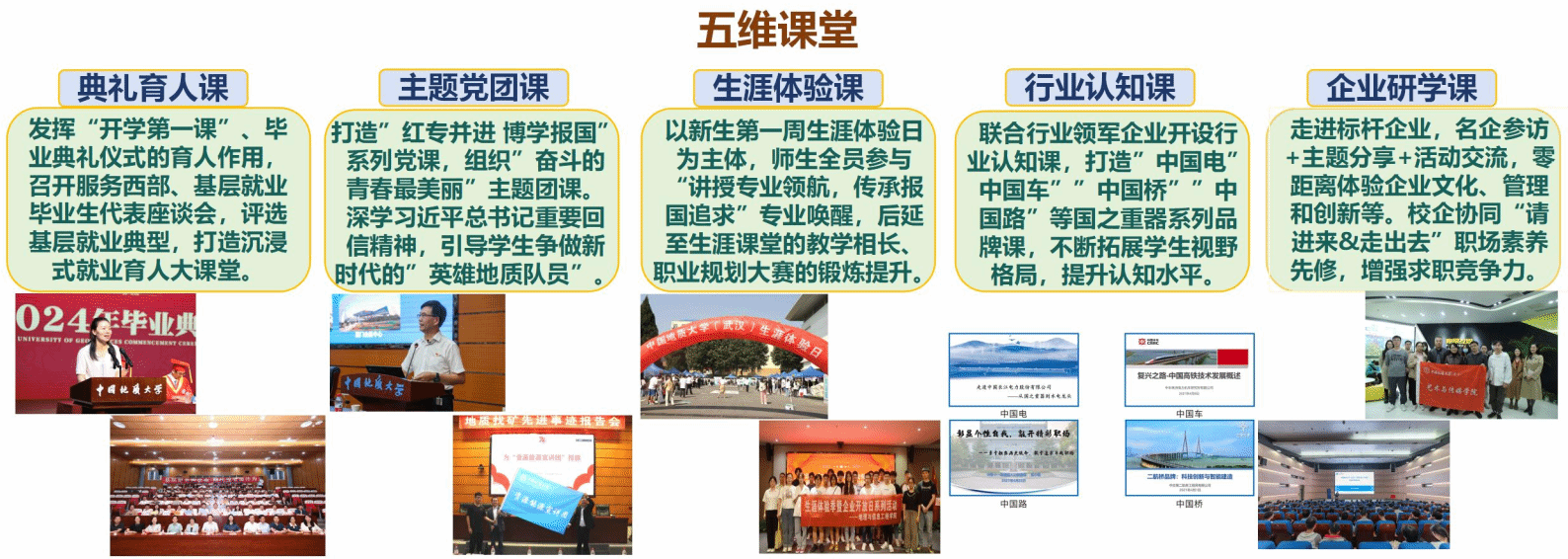 构建“五维课堂”,强化价值引领。持续打造典礼育人课、主题党团课、生涯体验课、行业认知课、企业研学课“五维课堂”,引导学生树立正确的成才观、职业观、就业观。通过“奋斗的青春最美丽”故事分享会、地质找矿先进事迹报告会等活动,厚植学生家国情怀,鼓励毕业生到祖国最需要的地方去。